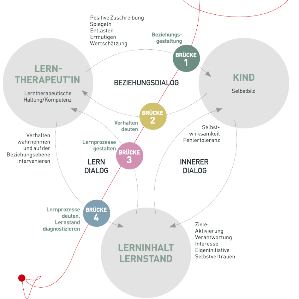 Die Therapieeinheiten finden in der Regel einmal wöchentlich für 45 Minuten statt. Jede Lerntherapiestunde folgt einer klaren Struktur, an der sich die Kinder gut orientieren können. Dabei kommt eine vielfältige Methodik zum Einsatz, die unterschiedliche Lernwege anspricht. Die Inhalte werden dabei abwechslungsreich, spielerisch und bewegungsorientiert gestaltet, um Motivation und Lernerfolg optimal zu fördern. Die Lerntherapieprozesse werden in regelmäßigen Abständen systematisch evaluiert, um die individuellen Entwicklungsschritte des Kindes zu dokumentieren und anzupassen. Auf Wunsch kooperiere ich mit Lehrkräften und anderen Fachstellen, um das Bestmögliche für Ihr Kind zu erreichen. Als Mitglied des Fachverbandes für integrative Lerntherapie (FiL) orientiere ich mich in meiner Arbeit an dessen Leitlinien. Die nebenstehende Grafik vedeutlicht, dass ein lerntherapeutischer Prozess immer auf verschiedenen Ebenen stattfindet. Ziel ist es, Brücken zu schlagen – damit das Kind Lernwege eröffnet bekommt und ein positives Selbstbild entwickeln kann.